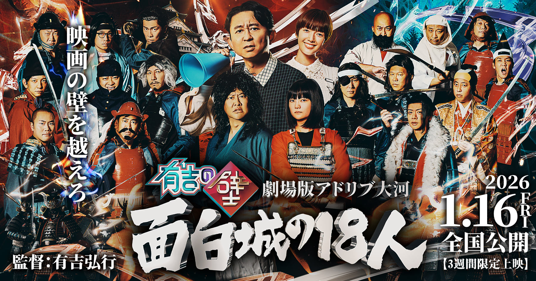 有吉弘行が映画監督になり、武将になりきった壁芸人たちにムチャブリをする「有吉の壁」の人気企画「アドリブ大河」がまさかの映画化!